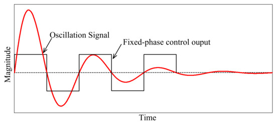 The principle of the fixed-phase controller is shown in Figure 4. It requires the switching time of DFIG reactive power to be in the same step with the frequency of the power oscillation associated with the critical oscillation mode. The transmission power, which is suggested and verified to be one of the most effective control signal to the damping controller [19,20], is selected as the input signal for damping control in this paper.