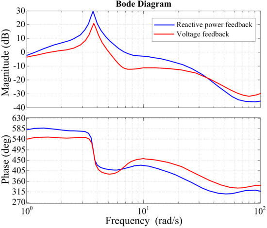 The bode diagram of reactive power feedback control and voltage feedback control.