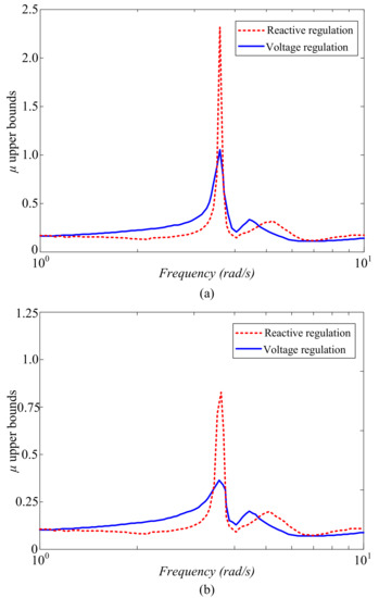 The -analysis results of two open loop systems—(1) with reactive power feedback control and (2) with voltage feedback control—are shown in Figure 7a. The -analysis results for two closed loop system are shown in Figure 7b.