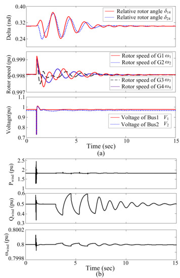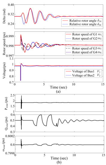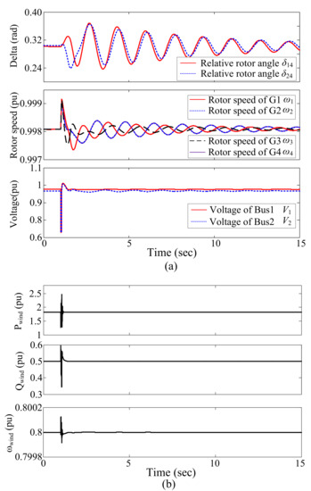 System dynamic performances without additional damping control for DFIG. (a) Generators dynamics, from up to bottom: and , rotor speeds of the generators, buses voltage; (b) DFIG dynamics, from top to bottom: active power of DFIG, reactive power of DFIG, and rotor speed of DFIG.