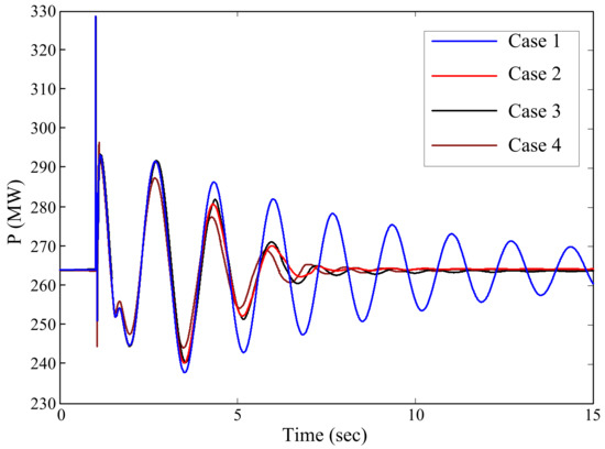 Transmission power between area I and area II. Case 1 corresponding to without damping controller; Case 2 and Case 3 corresponding to the damping controller with reactive power feedback and voltage feedback control scheme active at the same time, respectively; Case 4 corresponding to the voltage feedback control scheme with damping controller.