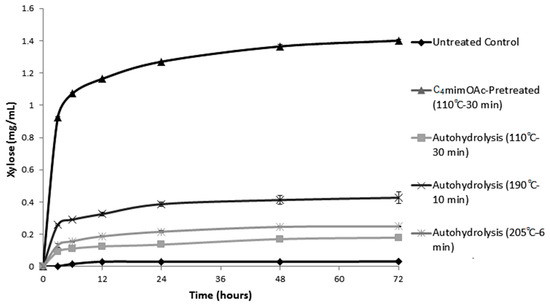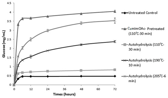 When pretreatment temperature was increased, a higher concentration of glucose was obtained. The major effect found by autohydrolysis on lignocellulosic material was removing the hemicellulose and thus reducing its hindrance, and improving the access of enzymes to the cellulose [20,21]. This effect can be clearly observed in Figure 1, where increased pretreatment temperature during autohydrolysis enhanced glucose release during enzymatic hydrolysis but xylose concentration was reduced because some amount of xylan had already been removed during autohydrolysis [19]. Reduction in xylose concentration at 205 °C can be attributed to the removal of some hemicellulose content during high temperature autohydrolysis, while low xylose concentration at 110 °C might be due to more lignin hindrance [19,22]. Many studies have confirmed the same effect of high-temperature autohydrolysis on the reduction of hemicellulose content [21,23]. It was mentioned in our previous study that C4mimOAc also had a significant effect on hemicellulose; however, compositional analysis and Fourier transform infrared spectroscopy (FTIR) data of pretreated bagasse revealed that the effect of ionic liquid on hemicellulose was still milder as compared to autohydrolysis [19].