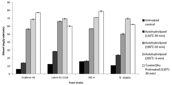 Fermentation of the pretreated samples of bagasse for bioethanol production is shown in Figure 3. The results revealed that different yeast strains have different abilities to produce ethanol from the available sugar. Ethanol production on bagasse pretreated by autohydrolysis at 110 °C for 30 min was 28.42 ± 0.12 mg/g-substrate when it was fermented with S. cerevisiae (Lalvin EC-118). The same strain exhibited a maximum ethanol production 66.02 ± 0.65 mg/g-substrate on the fermentation of bagasse pretreated at 190 °C for 10 min. S. cerevisiae strains are not able to ferment xylose, but are more efficient in glucose fermentation [12]. The autohydrolysis of sugarcane bagasse at 205 °C for 6 min could support the maximum ethanol production of 70.92 ± 0.09 mg/g-substrate when S. cerevisiae MZ-4 was used as the fermenting organism. A comparatively better ethanol production of 78.78 ± 0.94 mg/g-substrate was obtained from C4mimOAc pretreated bagasse at 110 °C for 30 min, and fermented with S. cerevisiae MZ-4 strain.