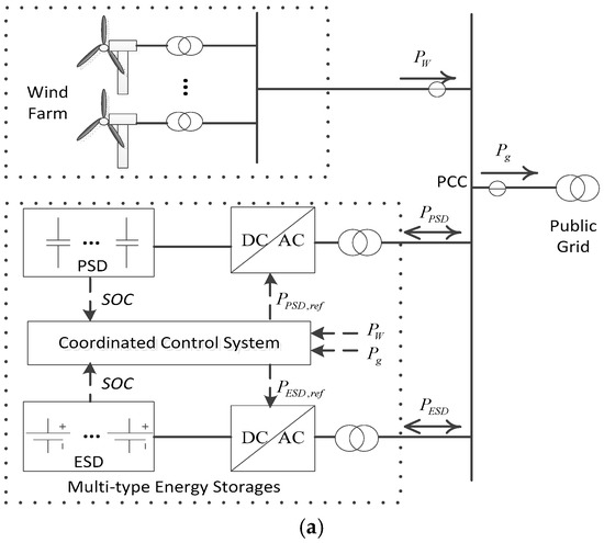 Figure 1a illustrates the structure of a multi-type energy storage system for wind farm fluctuation suppression. The ESD and PSD units are connected to the power network at the point of common coupling (PCC) together with wind farm.