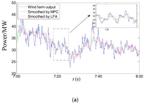 (a) Wind farm output power smoothed by MPC and LFA respectively; (b) Power fluctuation ratio without () and with () smooth control