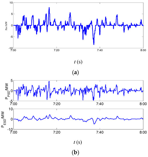 (a) Power profile of the total energy storage system; (b) Power profile of PSD () and ESD ().