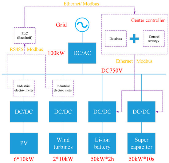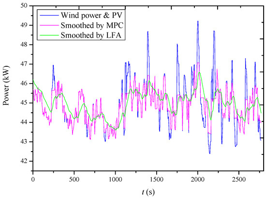 Additionally, a microgrid demonstration system was utilized to verify the proposed algorithm. The microgrid demonstration system was a DC microgrid, whose bus voltage is 750 V. It connected to the power grid through the DC/AC converter. It had 20 kW wind power, 60 kWp PV, a 50 kW Li-ion battery energy storage system and a 50 kW SC energy storage system. As can be seen from Figure 8, the information on wind power and PV, including current, power and so on, was read by the industrial electric meters. Then the information was uploaded to the PLC (Beckhoff product) through RS485/Modbus. The center controller received the information on wind power and PV from the PLC and issued the control instructions calculated by the control strategy to the multi-type energy storage system through Ethernet/Modbus. Firstly, MPC was adopted in the center controller to smooth the total fluctuation of wind power and PV. Then the actual data was stored in the database and analyzed again off-line with LFA method. As shown in Figure 9, the MPC-based method can be more effective compared with LFA in a condition of less time delay. In particular, about 5% power and 15% energy can be saved, as shown in Table 3.