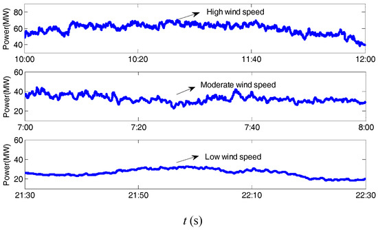 It can be seen that, for a certain wind turbine and certain wind speed changes, the power variation is proportional to the square of the initial wind speed. This means that a small wind speed variation may cause a large wind power fluctuation, especially at high wind speed. Although there are smooth effects for a wind farm with clusters of wind turbines, the fluctuations of output power are still high with wind speed variations. Figure 10 shows the wind power and the corresponding fluctuating levels at high, moderate and low wind speeds, respectively.