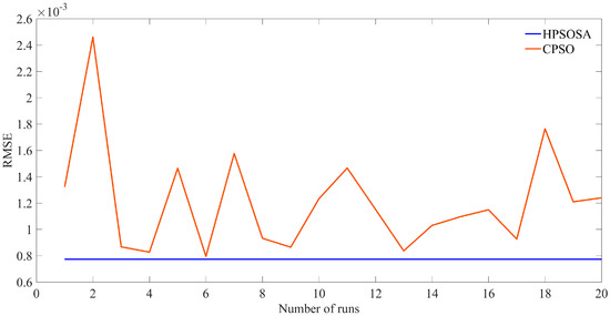 A measure of robustness of the HPSOSA and CPSO for 20 runs is shown in Figure 4. It is apparent from Figure 4 that the HPSOSA is able to achieve a minimum RMSE value in all 20 iterations and presents a robust solution for the parameter estimation problem. Whereas CPSO reached only once in the proximity of the minimum RMSE, achieved by HPSOSA.