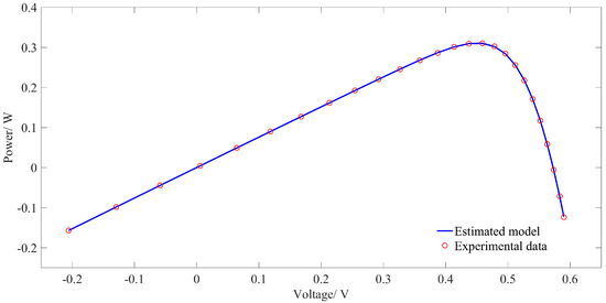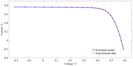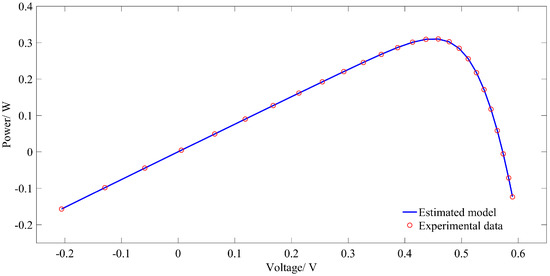 A further insight of how close the estimated values are with the experimental values has been given in Table 4, Figure 6 and Figure 7. Experimentally measured voltage, current and the error between measured current and estimated current, calculated by , have been tabulated in Table 4. Table 4 shows that very low error values portray high precision of the estimated parameters. Figure 6 plots experimentally measured I-V data points and I-V data obtained by estimated parameters. Figure 7 plots experimentally measured P-V (power-voltage) data points and P-V data obtained by estimated parameters. Figure 6 and Figure 7 clearly portray that the estimated data is in close agreement with the experimentally measured data.