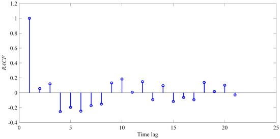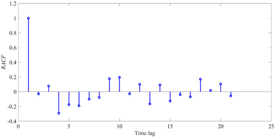 Another test of quality of the estimated model is to calculate residual autocorrelation function that describes that the estimated model satisfactorily defines a given set of data. The test is implemented in two steps: (1) Examination of the estimated residuals described by . (2) Calculation of RACF at different time lags using the following expression: