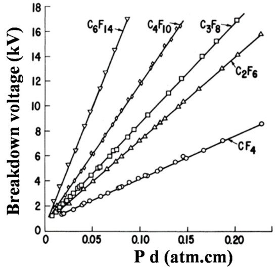 It is accepted that fluorinated compounds have the best insulation performance. This is helped by the presence of fluorine, a very electronegative element. In research efforts, particular attention was paid to some families of fluorinated molecules including perfluorocarbons (PFCs), which are gaseous halogen compounds of the fluorocarbon family (FC). These fluorinated electronegative gases are composed exclusively of carbon and fluorine atoms. The main PFCs proposed as gaseous dielectric are CF4, C2F6 C3F8, and C4F8. These have high dielectric strength (breakdown voltage); Figure 1 gives the variation of the breakdown voltage versus the pressure—electrode gap product (P.d), i.e., Paschen curves of these gases [10]. Table 3 gives the main properties of these gases. Note that among these gases, C4F8 appears to be the most interesting from the point of view of the dielectric strength, which is 1.25 to 1.31 times higher than that of SF6 [11]. However, its high liquefaction temperature makes its use very difficult. Nevertheless, it remains a promising gas component for mixtures intended for gaseous insulation [12,13].