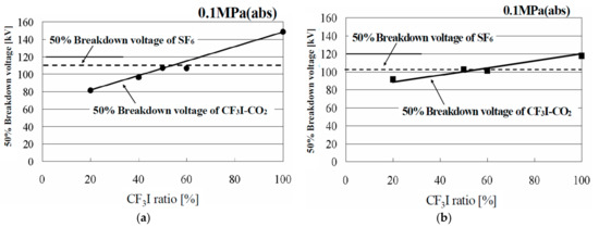 Breakdown voltage characteristics of CF3I-CO2 mixtures in a sphere-sphere electrodes geometry in positive (a) and negative (b) polarity: the diameter of sphere is 50.8 mm and the electrode gap is 10 mm [34]; the y-axis indicates the absolute values of 50% breakdown voltage.
