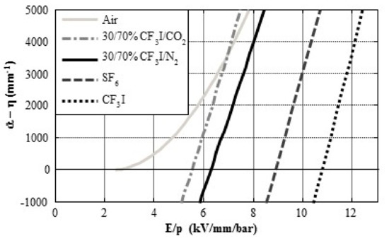 Effective ionization coefficients in various gases (Air, SF6 and CF3I,) and gas mixtures (30/70% CF3I/N2 and 30/70% CF3I/CO2) [35].