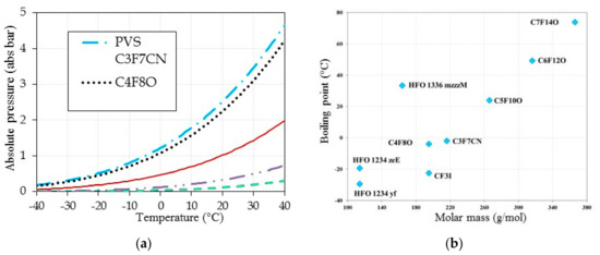 (a) Graph of the saturated vapor pressure as a function of the temperature of some complex fluorinated gases; (b) dependence of the boiling point on the molar mass of selected gas molecules [38].