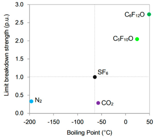 Naturally, the initial investigations were focused on natural gases (N2, CO2 [4], and dry air [5]) and the halogenated products that have reduced GWP such as trifluoroiodomethane (CF3I) [6], perfluorinated ketones [7], hydrofluoroolefins (HFOs) [8] and fluoronitriles [9]. The goal of such investigations was to identify new eco-friendly candidates with equivalent dielectric strength to SF6. Unfortunately, polyfluorinated gases have a high boiling point, which is a drawback for their use in low-temperature electrical apparatus applications. To overcome this shortfall, these halogenated gases are mixed with ordinary carrier gases such as dry air, N2, or CO2. Note that the substitute gas or gas mixture must be non-corrosive and must not interact with materials (insulating materials and metals) of the gas-insulated systems in which it is used.