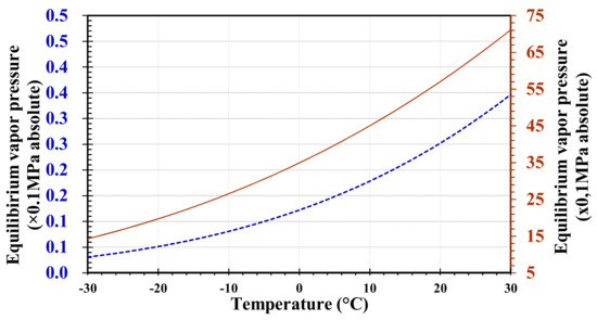 The vaporization of perfluoroketone is obtained above 24 °C. Because of this high boiling point, the gaseous state of this chemical element is maintained at a pressure lower than atmospheric pressure. Fluoroketones can only be used as an additive at a pressure below the saturated vapor pressure (Figure 6 and Figure 7). Indeed, by adding fluorine (halogen element) in the chemical formulation, the dielectric strength of the complex molecule is improved. In contrast, the boiling point increases considerably. Therefore, this gaseous compound cannot be used alone for insulation applications where the operating temperature of the GIS may drop to −30 °C or below.