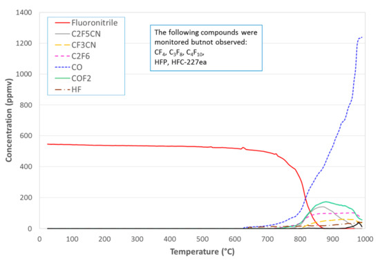 Fluoronitrile gas compound is a polar gas that has a specific mass of 8.11 kg/; its purity is greater than 98.54%. It is odorless, highly electronegative, colorless, and chemically stable up to a temperature of about 700 °C (the appearance temperature of carbon monoxide) [50]. Table 12 and Table 13 summarize the basic chemical and physical properties of fluoronitriles. Figure 10 gives the main degradation products and thermal stability of the dielectric fluid (CF3)2CFCN analyzed by infrared spectroscopy (FTIR) [51]. Carbon monoxide is the main decomposition product; its dielectric strength is about 40% of that of SF6 [51].