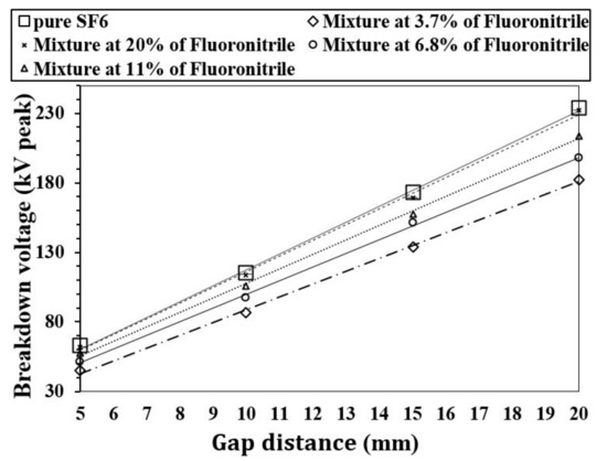 Experiments conducted on gas mixtures consisting of CO2 and fluoronitrile NovecTM 4710 in concentrations ranging 3.7 to 20% with different electrode geometries (namely plane-to-plane, sphere-to-sphere, sphere-to-plane, and rod-to-plane; and different field utilization factors), under AC and lightning impulse (LI) voltages show that in a quasi-homogeneous electric field, the equivalent dielectric strength with 0.1 MPa SF6, at identical total pressure, is reached by a mixture containing 20% fluoronitriles [58]. The 3.7% fluoronitriles/96.3% CO2 mixture constitutes a good compromise and an appropriate gas mixture for high-voltage apparatus insulation in view of the pressure and low ambient temperature applications (−30 °C). This compromise takes into account different criteria including the working pressure and temperature as well as the environmental impact (global warming potential). This mixture, in a uniform electric field, reaches 72% of the dielectric breakdown of pure SF6 at 5.5 bar absolute. In homogeneous and quasi-homogeneous fields, equivalences to 0.55 and 0.65 MPa SF6 are obtained with 3.7% Fluoronitriles/96.3% CO2 mixtures at 0.88 and 1.04 MPa total pressure, respectively, and lead minimum operating temperatures of −30 and −25 °C, respectively.