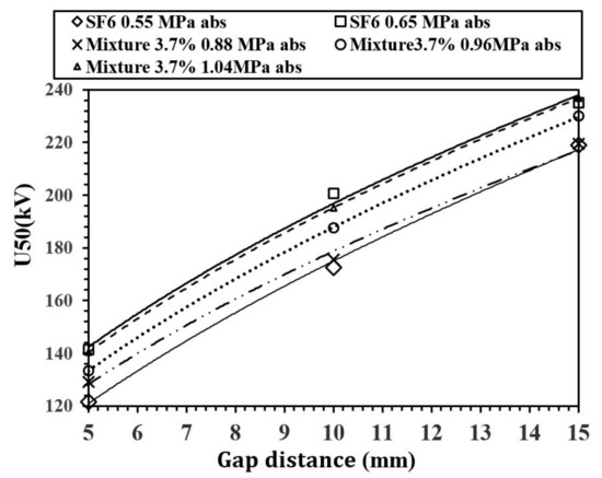 In practice, the dry air insulation and mixtures of N2-O2 (80% N2–20% O2, 60% N2–40% O2 and 40% N2–60% O2) under lightning impulse voltages exhibit better performance (dielectric strength) than those of N2 or CO2 on their own [25]; and the dielectric strength under positive lightning impulse voltages for dry air, CO2, N2, and their mixtures are higher than the negative ones. Also, the dielectric strength of N2 and N2–CO2 mixtures increases quasi-linearly with pressure up to 1.6 MPa under lightning impulse voltage (LI) [4]. This quasi-linearity has been also observed for N2 and CO2 in AC, DC, and lightning impulse voltages by Beroual and Coulibaly [26].