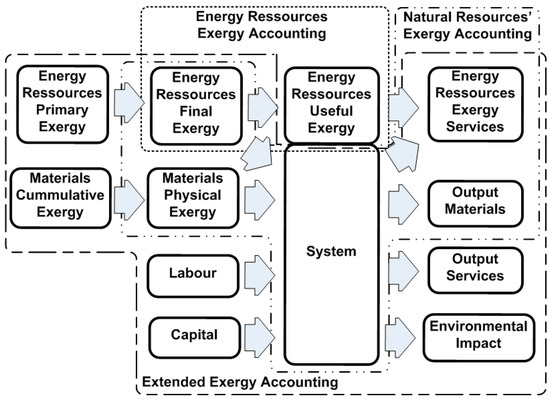 Finally, EEA is similar to NREA but also introduces capital and labour as inputs and environmental impact as a virtual input, integrating the social, economic and environmental pillars of sustainability. Translating capital, labour and environmental impact externalities into an exergetic cost is a key feature of EEA as it reflects the real thermodynamic system’s efficiency and the usually hidden resource costs [8]. The production factors are no longer just energy resources (EREA) or energy and matter (NREA) but also immaterial flows which are essential to assess the system’s behaviour (Figure 1). The exergy of inputs is no longer the physical and chemical exergies but the cumulative exergy introduced by [9] in the cumulative exergy consumption methodology (CExC). The latter takes into account the sum of all the exergetic content of resources that are consumed in a production chain. Consequently, the main focus of EEA is to find the real exergy embodied into the output flows under study, adding not only all exergy necessary to bring all inputs to the specific space and time domains but also all labour, capital and environmental impacts.