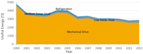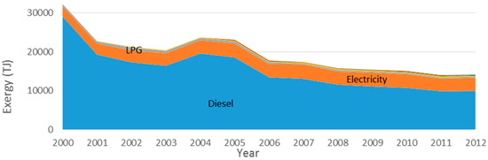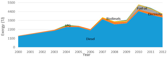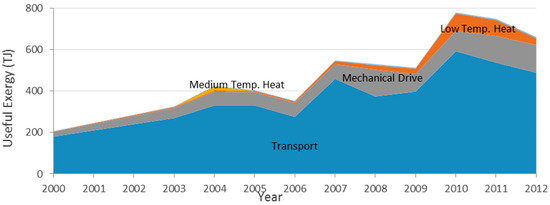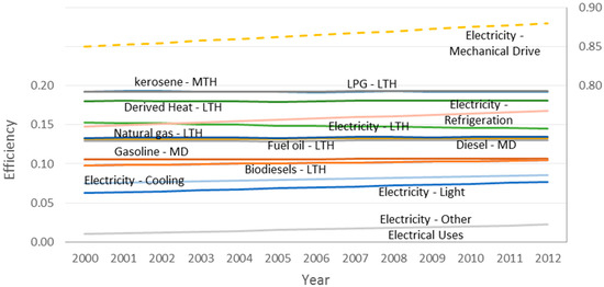 Efficiencies vary by end use and by energy carrier since the technologies involved are different. Low temperature heat (LTH) efficiencies considered were 10% for solid biofuels and biodiesel, 13% for natural gas and fuel oil, 15% from electricity and 18% from derived heat. Medium temperature heat (MTH) achieved better efficiencies since higher temperature flows have higher exergetic content. Both liquefied petroleum gas and kerosene were considered to have a 19% transformation efficiency. Gasoline and diesel were used for transportation and mechanical drive (MD) with 11% and 13% efficiencies, respectively. Also electricity was used to drive mechanical appliances with an increasing efficiency from 85% in 2000 to 88% in 2012 (Figure 2). All efficiency values were obtained from [34,35].