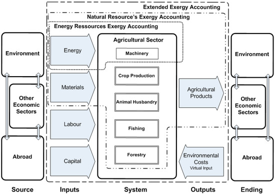 Exergy analysis is an assessment methodology that has been used to account for efficiency at several scales, which can be society as a whole, economic sectors or industries. The term efficiency usually reflects a narrow approach that considers only one type of output and input flows. However, an efficiency measure of the AFF sector that would take into account several types of flows, such as the extraction from the environment of renewable and non-renewable resources, undesired output flows such as waste and pollution and the capital and labour flows involved, could present useful insights about its sustainability. Further assessment of other aspects, such as the economic viability of agriculture or the quality of life of farmers, would still be needed for a complete evaluation of sustainability.