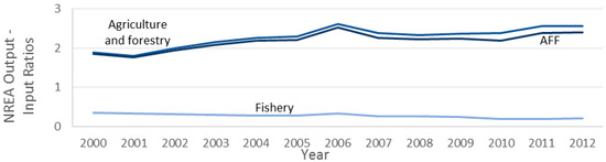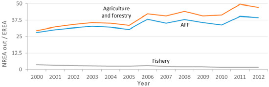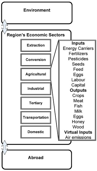 In this study, there is a clear distinction between the Agricultural, Forestry and Fisheries Sector and the environment (see Figure 3) focusing on the efficiency of anthropogenic activities. We consider crops, wood removals and fish from aquaculture as outputs because they are a product of an anthropogenic activity. In contrast with other studies [23,24,25,26,27,28,29,30] we do not count them as an extraction from the environment because they do not appear spontaneously. In contrast, we consider fish catch as a natural input from the environment.