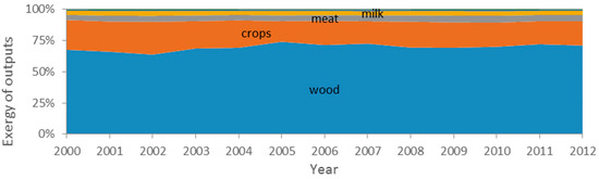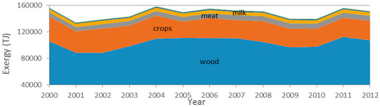 About two thirds of all agricultural, forestry and fisheries exergetic output is from wood removals. The changes in the overall annual production that ranges between 140 PJ to 160 PJ are controlled by changes in wood production (for a more detailed description see Appendix B). The aggregated production intended for food and feed decreased 14% mainly due to a 20% decrease in crops harvested despite a 20% increase in meat production (Figure 11).