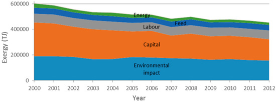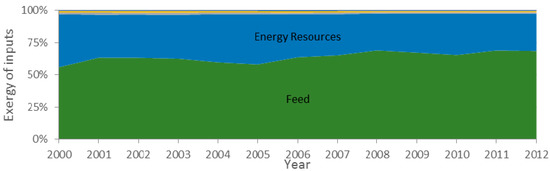 First exclusive NREA approaches to agriculture also included virtual environmental impact as an input to integrate pollutant emissions [15]. The input-output ratio was approximately 10 (ten times more exergy in inputs than outputs) but solar radiation was responsible for 90 to 95% of the inputs with an estimated photosynthetic efficiency of 4.5%. A combination of EEA and cumulative exergy extraction from the natural environment was proposed by [16] to measure the agricultural performance of 29 countries from 1990 to 2003. As important findings, the study highlighted the three types of resources that agricultural production most extracts from the natural environment: organic content in top soil, feed and water. Finally, it concluded that the exergy efficiency in the livestock sector is much lower than in the crop sector.