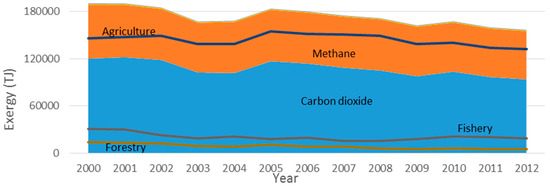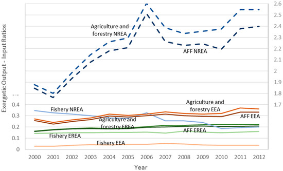 Three exergy accounting approaches are used to evaluate exergy efficiency: the Energy Resources Exergy Accounting (EREA), the Natural Resources’ Exergy Accounting (NREA) and the Extended Exergy Accounting (EEA). To test the consistency of the results provided by these methodologies, we apply them to evaluate the Portuguese agricultural, forestry and fisheries (AFF) sector, from 2000 to 2012. EREA shows an increase of 30% in the efficiency of the Portuguese AFF sector, while NREA and EEA methodologies increases of 27% and 43%, respectively. Although the results are consistent for the AFF sector, the same does not happen in the fisheries subsector, whose exergetic efficiency increases 14% with the EREA but decreases 42% with the NREA approach. The ratio of output to useful exergy reveals that a better thermodynamic efficiency is not translated into a higher energy service efficiency because fishing vessels have to travel more to get the same fish. Thus, results provided by the EREA and NREA approaches are complementary and both are needed to provide a realistic picture of exergy efficiency. On the other hand, results obtained by the EEA approach are dominated by capital and environmental impacts, revealing the disproportionality between material and immaterial inputs in this methodology.