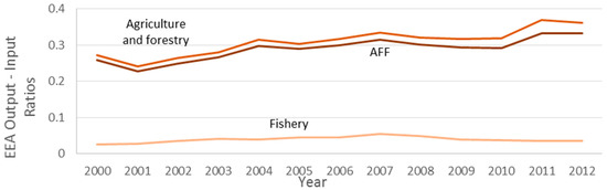 AFF sector and subsectors efficiencies by EREA approach considering year 2000 carrier-end use efficiencies.