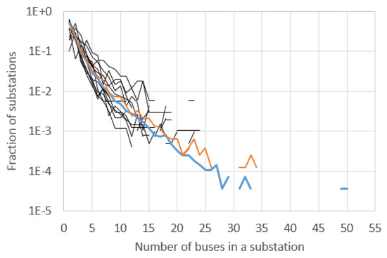 The EI averages 2.3 buses at each substation, and the WECC averages 2.5. The subset cases considered vary from 1.7 buses per substation to 4.5. The number of buses represented in each substation can be affected by modeling decisions about how much detail is represented, including generator step-up transformers and sub-transmission network equivalents. Figure 1 shows the distribution of substation size. There are many substations with 1–3 buses, much fewer with 4–10 buses, and fewer still with 10–25. The larger the case is, the longer the tail of this distribution, as Figure 1 shows. For cases on the order of 100 buses, the tail could end at about the 1% threshold, which would make a largest substation of about 8 buses acceptable. The EI and WECC cases (orange and blue in Figure 1) have on the order of 10000 buses; their tail extends to the 1 × 10−4 threshold at about 27 buses.