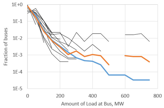 Probability mass function of the amount of load at load buses, for EI (blue), WECC (orange), and 12 subset cases (black).