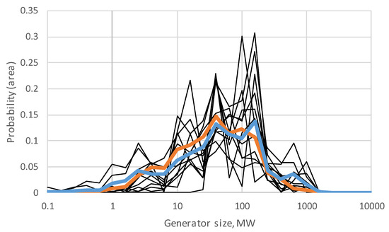 Probability density of generator capacity, with height representing area since it is a logarithmic plot, for EI (blue), WECC (orange), and 12 subset cases (black).