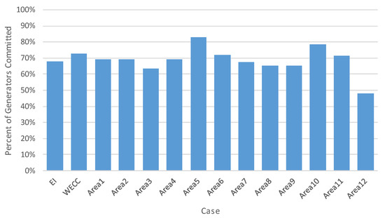 Percent of generators committed. The percent of generating units which are committed, that is, connected to the grid and generating power positive active power, is an important metric of the reserves and economics of the generation fleet. As shown in Figure 4, this value is 60–80% for most of the real cases considered.