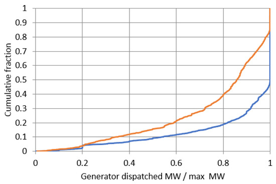 Cumulative fraction plot of generator dispatch percentage for EI (blue) and WECC (orange).