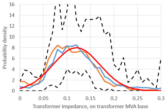 Probability density of transformer reactance, for EI (blue), WECC (orange), and envelope of 12 subset cases (black), and normal fit (red).