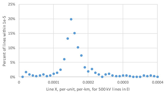 Transmission line reactance. Transmission line parameters are organized by voltage level, since many aspects of transmission line design depend on the voltage level. The per-unit reactance depends heavily on the length of the transmission line, which, while not available exactly, can be approximated from the geographic distance between the two substations it connects. This distance will always be shorter than the actual right-of-way length, but serves as an approximation, especially for longer lines. Transmission line per-km impedances at a certain nominal voltage level typically have a unimodal distribution with heavy tails corresponding to outliers, as shown in Figure 7. Some of the outliers may be due to smaller transmission lines for which the per-distance metric is less accurate. Similar to the transformer parameters, the transmission line statistics used are the 10th percentile, the 50th percentile (median) and the 90th percentile. This encompasses most transmission lines. Table 3 shows these percentages. Data on the distribution of transmission line parameters is also significantly impacted by the number of conductors bundled together in a phase, with 2- and 3- conductor bundling reducing the 345 and 500 kV lines.