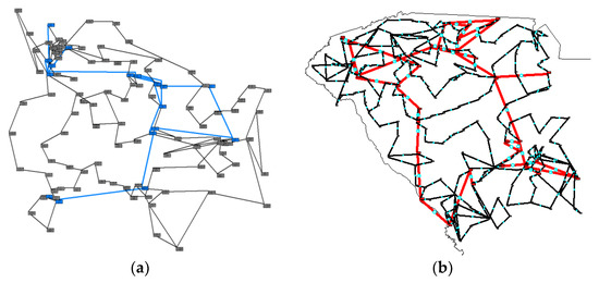 (a) One-line diagram of the ACTIVSg200 test case, with 230 kV lines in blue and 115 kV lines in black. (b) One-line diagram of the ACTIVSg500 test case, with 345 kV lines in red and 138 kV lines in black.