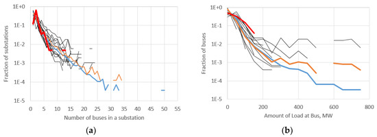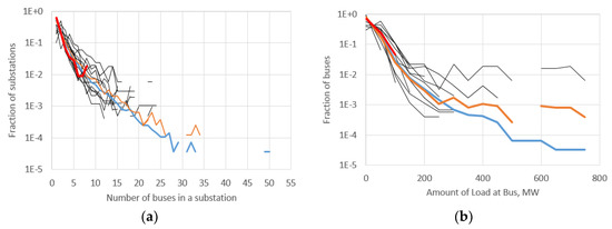 Percentage of substations containing load. Categorizing buses or substations as load, generating, or neither plays an important role in synthesis methods and relates to the core energy delivery purpose of power systems. Except for two cases, areas 5 and 9, all of those studied show 75–90% of substations containing load, as shown in Table 1. Load, of course, is an aggregation of sub-transmission, distribution, and customer-level circuits, which for these exceptions appears to be grouped at a higher level than for typical grid cases.
