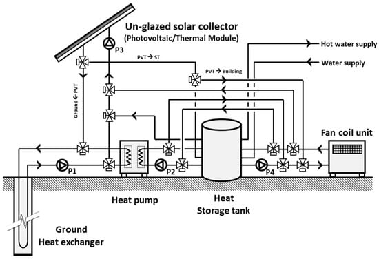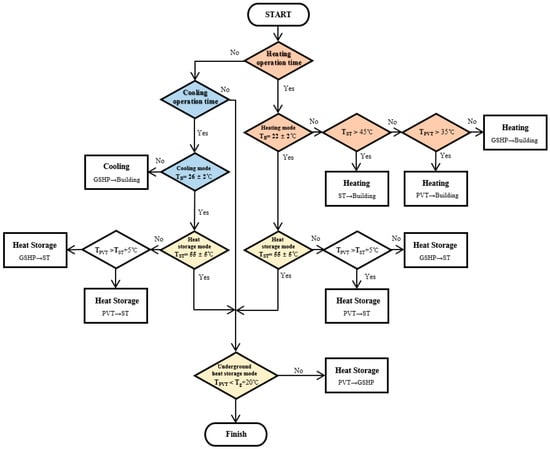 Considering the heat source supply temperature of the heat pump and the temperature of the heat storage tank, the heating using solar heat is set to be supplied directly to the building when the temperature exceeds 35 °C. When the heating operation using the heat storage tank and the solar heat is not performed, the heating operation using the ground source heat pump is performed. The heat storage operation works when the temperature of the heat storage tank is reduced to 50 °C or less under the condition that the heating operation is not operated. The heat-storage operation mode can be divided into the following two types according to the type of heat source: use of the PVT module and use of the heat pump. When the outlet temperature of the PVT module is higher than the outlet temperature of the HST load-side, the heat-storage mode operates to use solar heat. The heat-storage mode using the heat pump works when the PVT module is not used. The underground heat storage mode can be operated to prevent reduction of the electrical efficiency and to recover the underground temperature. This mode operates if the outlet temperature of the PVT module is higher than the underground temperature during non-heating or non-heat-storage operations.