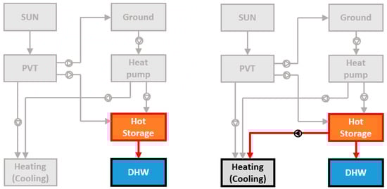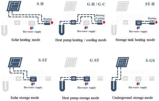 The Geo-PVT system has seven operation modes, as shown in Figure 2, including three heating-operation modes, one cooling mode, two heat storage modes, and an underground heat storage mode. The cooling operation is only performed through the heat pump. Each operation mode of the Geo-PVT system depends on the temperature condition of heat source and the existence of loads. The operation mode can be categorized into the following three types: heating and cooling mode, heat-storage mode, and underground heat-storage mode.