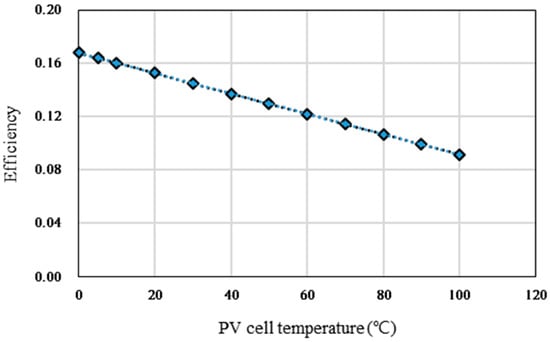The power generation of the PVT module can be estimated by multiplying the solar energy incident on the surface with the efficiency of the photovoltaic module, as following Equation (4). S is the net absorbed solar radiation and accounts for the absorbed solar radiation minus the PV-power production. Equation (5) is the formula to calculate S. The efficiency of the PV cells is a function of the PV cell temperature and the incident solar radiation, as following Equation (6). Figure 5 indicates the efficiency of the PV cells as a function of the cell temperature at the constant radiation:
