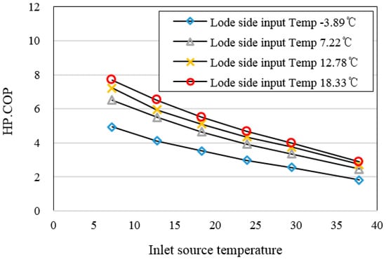 The heat pump performance is based on the entering source-side and load-side temperatures and is in accordance with the catalog data. The heat-pump catalog data is shown in Figure 6 and Figure 7. It was set that the ground-heat exchanger is a single U-pipe buried in a vertical borehole at a depth of 150 m. To explain more about other components, the heat storage model expresses the thermal performance of a fluid-filled sensible energy in storage tank. And the FCU model represents a fan coil where the air is heated or cooled as it passes across coils embracing hot and cold liquid flow streams. Plus, the pump model is simply set to a mass flow rate using a variable control function.