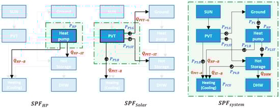 System performance is calculated by the total energy consumption and total energy production. In this paper, the fixed time step in the simulation statement is 5 min, and the system performance was estimated by the seasonal performance factors (SPFHP, SPFSolar, and SPFSystem) based on the simulation results in each case. Here, the seasonal performance factor is a coefficient that can be obtained by dividing the total cooling and heating energy during the heating and cooling season by the total power consumption. The calculation formula is as following Equations (8)–(10). The calculation process is illustrated in Figure 8. “Q” represents the useful energy from the output of the system, and “P” represents the sum of all of the input electrical energy that is required to produce the useful energy. This method is based on the report of IEA Task 44 Annex 38: