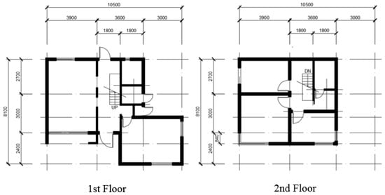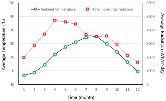 The building model for simulation was set as 106 m2 standard housing supplied by the Ministry of Agriculture, Food and Rural Affairs in Korea, which is an authorized model with “representative” to be widely popularized. Therefore, the reliable model can provide a great ripple effect of the hybrid system. The building model is divided into two floors and accommodates a living room, four bedrooms, and a kitchen. The floor plan of the building is shown in Figure 9 [21]. The weather data of the simulation model is based on Seoul, South Korea, which was provided by Meteonorm. An average outside temperature and solar radiation in Seoul described in Figure 10.