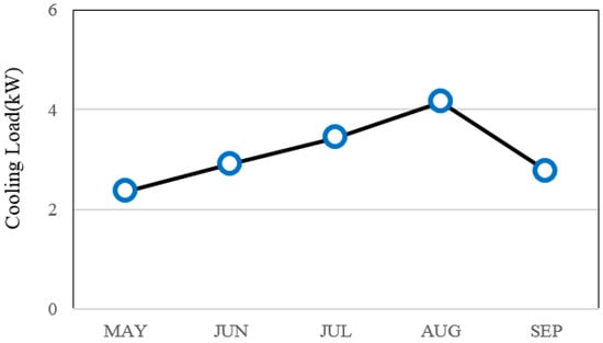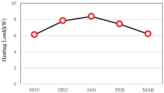 The heating load of the building was calculated to determine the capacity of the system. The peak heating load was verified as 8.34 kW for the heating period in the target area. By using the peak heating load as the basis, the GSHP capacity was configured. The peak heating and peak cooling loads for Seoul are shown in Figure 11 and Figure 12. The capacity of the heat pump, for which the peak heating load is considered, was determined as 10 kW.