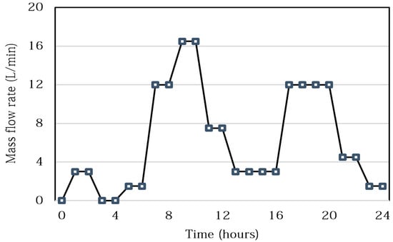 The thermal properties of the soil was based on the features of granite which is widely distributed in Korea. The capacity of the PVT system was determined as 3 kW in consideration of the power consumption of the heat pump, which was the maximum capacity for a residential house that can receive a subsidy from the Korea Energy Agency. The PVT module with a 15.33% electrical efficiency was used referring to the preceding research study [24]. The solar absorption area of the PVT system in one module was 1.63 m2, so the total area is 20 m2. The detailed conditions were set according to those in Table 2. The daily flow-rate distribution of domestic hot water (DHW) is described in Figure 13, and the daily DHW distribution profile was based on the advanced research [25].