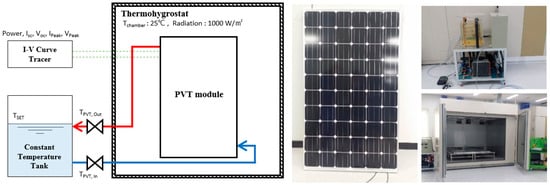 The constant temperature and humidity chamber used in the experiment was the AL SEC4100 manufactured by ATLAS (Linsengericht, Germany), and the artificial light source was irradiated using a metal halide lamp (Uniformity Class B) capable of adjusting the emission spectrum as the light source. The DS-100c I-V curved tracer was used to measure the electric current-voltage performance. The surface temperature of the module was measured using a thermocouple thermometer at the center of the top, middle, and bottom of the module, and data was recorded using a GL820 Data Logger (Graphtec, Yokohama, Japan). Table 3 indicates the specification of the measurement equipment. Experiments using a prototype PVT module were carried out at a solar photovoltaic center located at Techno Park (Chung-buk Province, South Korea). The nominal specifications of the PV module used in the experiment are listed in Table 4.